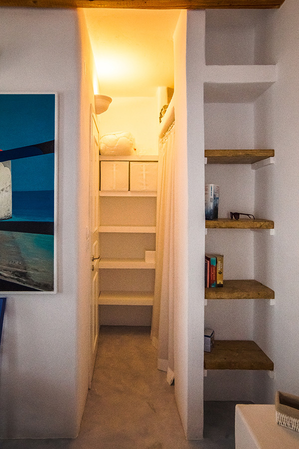 Χτίστηκε το 2012-2013 στο πάνω μέρος του πολύ απόκρημνου οικοπέδου, ακολουθώντας τη διαμόρφωση του εδάφους, δημιουργώντας μ' αυτό τον τρόπο μια σειρά από σκάλες, βεράντες και πολλές απομονωμένες γωνιές. Το κυρίως σπίτι είναι διώροφο και αποτελείται στο ισόγειο από ένα ανοιχτό livingroom με κουζίνα και ένα WC, καθώς και ένα δωμάτιο ξένων, ενώ ο όροφος έχει μόνο το κύριο υπνοδωμάτιο με το μπάνιο του και τις δικές του βεράντες. Στο ισόγειο υπάρχει επίσης μια βεράντα με θέα και μια ανοιχτή τραπεζαρία με εκπληκτική θέα επίσης. Σε πιό κάτω επίπεδα υπάρχουν δύο studios με δική τους κουζινίτσα και μπάνιο, καθώς και ένα γκαράζ με αποθηκευτικό χώρο.