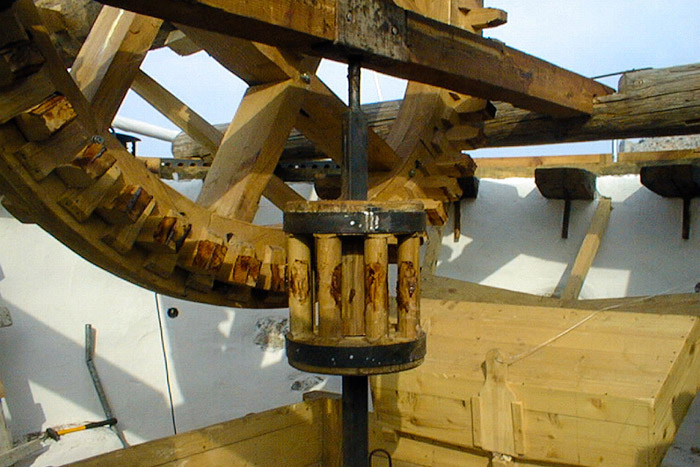 They were initially nine, and they are dated back to the 17th century (the oldest) and up to the 19th century (the newest). The two of the three missing today were destroyed due to the construction of the peripheral road leading to the castle, but you can still see the foundations of the third one on the top of the hill, above the last restored one (The Mill's Museum). Initially Domon made the architectural plans and the financial plan for the project. It was then approved from the EU and we then started working in the year 2000. One of these mills (the upper one) is dedicated as a living museum of an old mill: it is restored exactly as it was then, with a functional (still working) mechanism. The others are arranged as multifunctional spaces, exhibition spaces and the lower one is converted into a café with a magnificent view. Below you can see the whole process of the restoration, the final result and how they are today.
